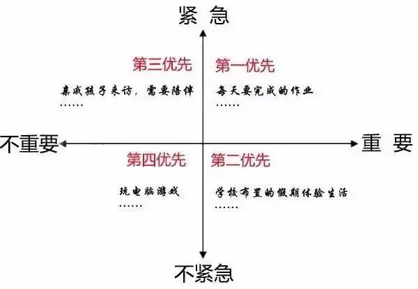 把一天要做的事情分为:重要紧急、重要不紧急、紧急不重要、不紧急不重要,明确了事情的先后顺序便能做到心中有数了。
