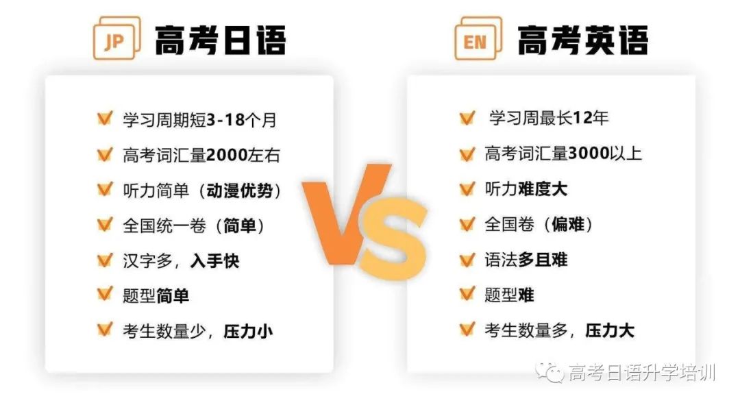 学习周期短,见效快,提分容易。通常情况下,平时英语考试不及格的学生,高考英语成绩提高到100分以上非常困难,但改学日语后,进班英语分在60分以上的学生,通过一年半或两年系统学习后,日语高考分可以达到110-140分;
