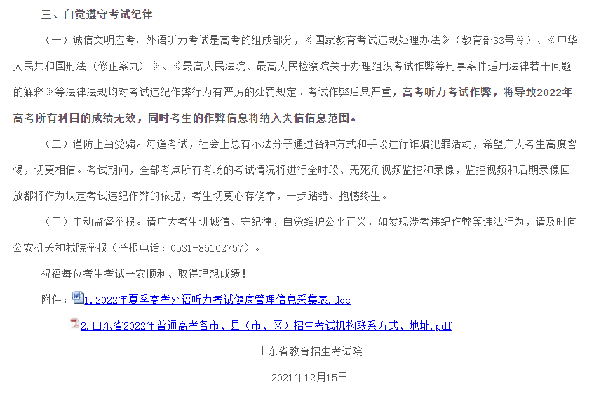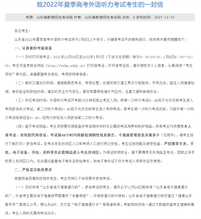 下面是山东省教育招生考试院发出的《致2022年夏季高考外语听力考试考生的一封信》全文,一起来看看: