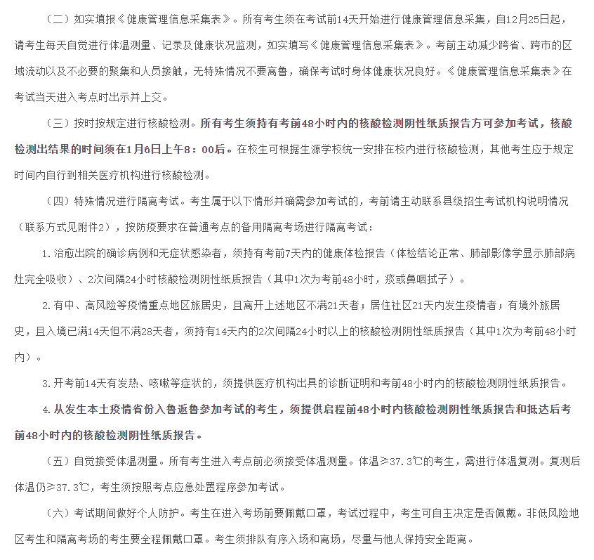 另外,考生还须持有考前48小时内的核酸检测阴性纸质报告方可参加考试,核酸检测出结果的时间须在1月6日上午8:00后。